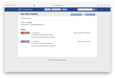 CentralPlanner ersetzt in der Gastronomie nicht nur das klassische Reservierungsbuch aus Papier, es bietet noch viel weitreichendere Möglichkeiten. Übersichtlich gestaltet können Sie alle notwendigen Informationen zur Reservierung hinterlegen, neben den Kontaktdaten etwa den Raum oder den Tisch. Zusätzlich können aber auch andere Informationen eingetragen werden, die für Ihr Personal und Ihre Gäste den Ablauf reibungsloser gestalten. Muss ein Kinderstuhl zur Verfügung stehen? Ist Ihr Gast Vegetarier? Informationen, die in der Gastronomie das Wohlbefinden des Gastes steigern, auf Papier aber nur einmal verwendet werden und dann verloren gehen. Nicht so bei einer digitalen Gastronomie Software. Das Wissen bleibt Ihrem Restaurant und Ihrem Personal dauerhaft online verfügbar.